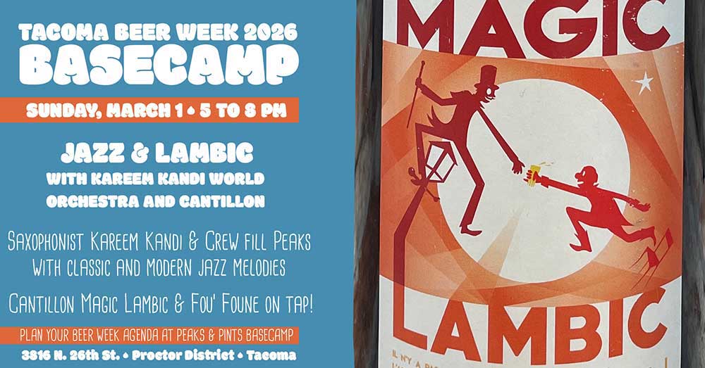 Sunday slows the tempo as Peaks & Pints’ Tacoma Beer Week Basecamp aligns with Kareem Kandi’s monthly jazz residency at Peaks & Pints, where saxophone lines drift through the lodge like soft rain and rare Cantillon lambics pour with quiet intention. Magic Lambic and Fou’ Foune arrive as gentle invitations rather than hype — fruit-laced acidity unfolding alongside bass lines from Greg Feingold and steady rhythms from Jacques Willis. The room leans into listening, conversations stretch, and the festival’s momentum softens into a shared exhale. Sunday Jazz Night, 5–8 p.m., Peaks & Pints, North 26th Street, Tacoma, no cover