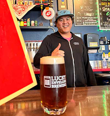 Lucky Envelope co-founder and head brewer Barry Chan stands behind his Yinz Jawn amber lager.